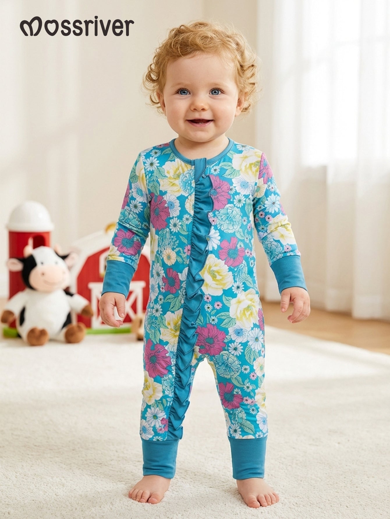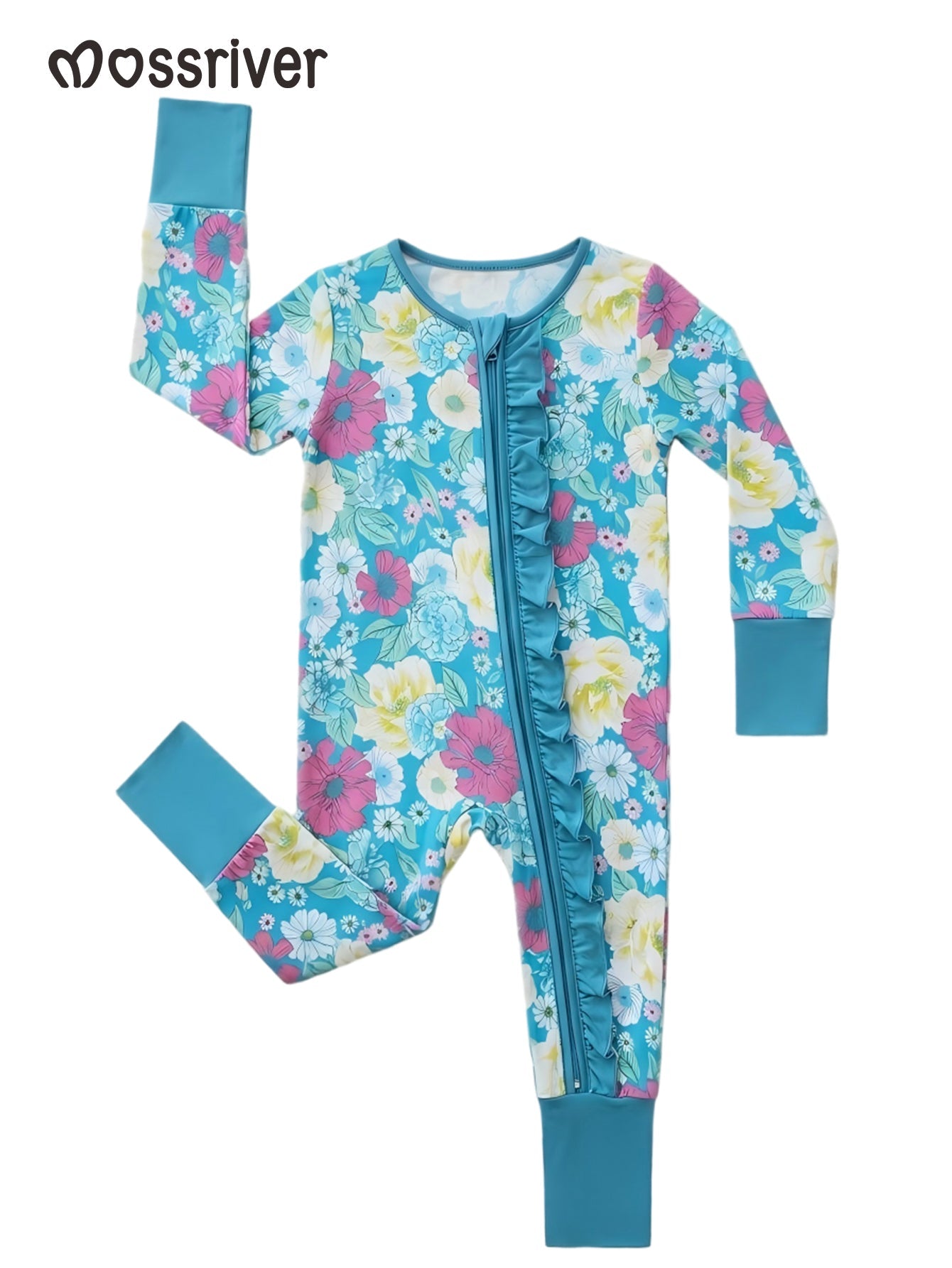 Wrap your little one in the gentle embrace of our MOSSRIVER baby girl's one-piece pajamas. Crafted from a premium blend of 95% bamboo fiber and 5% spandex, this sleepsuit offers exceptional softness and a comfortable stretch, perfect for delicate skin. The adorable "Turquoise Floral" print features a delightful array of white, pink, and yellow blossoms against a vibrant turquoise backdrop, bringing a touch of springtime joy to any time of year. Designed with practicality in mind, this long-sleeved footie features integrated mitten cuffs to protect tiny hands and a convenient double zipper for easy diaper changes. The ruffled detailing adds a sweet, feminine touch. These pajamas are not only incredibly soft and comfortable but also durable and easy to care for, making them an excellent value for everyday wear. Suitable for all seasons, they make a wonderful gift for baby showers or new arrivals. * Snug fit in accordance with all CPSC safety regulations. Our pajamas are never treated with flame-retardants or chemicals!