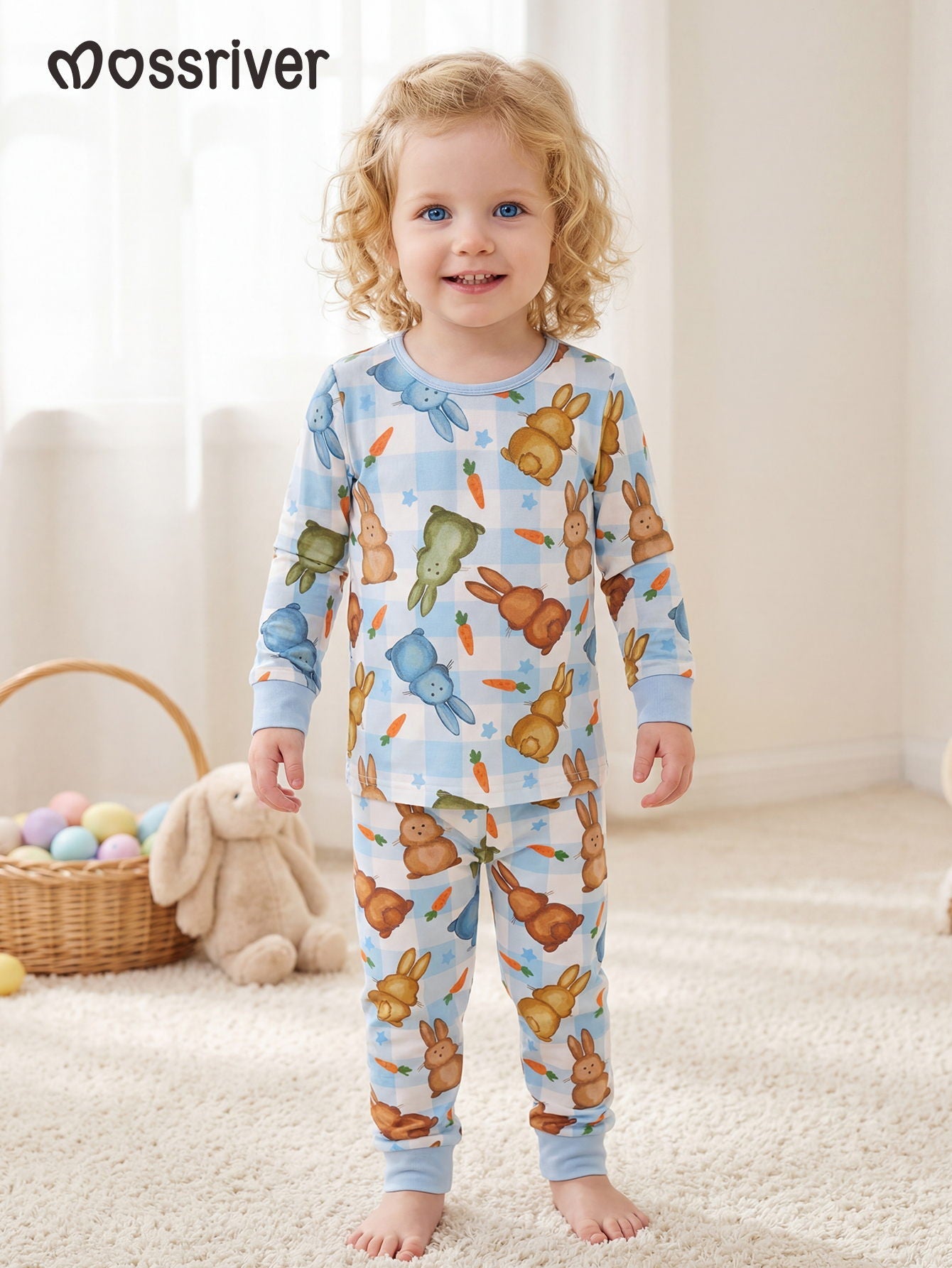 Indulge your little one in the gentle embrace of our MOSSRIVER baby pajama set. Crafted from a premium blend of 95% bamboo fiber and 5% spandex, this set offers exceptional softness and a delightful stretch, ensuring all-night comfort for your baby. The breathable and lightweight fabric makes it perfect for year-round wear. The charming print features an array of adorable bunnies and scattered carrots against a subtle blue and white plaid backdrop, adding a touch of playful whimsy to bedtime. Designed for practicality, this snug-fitting two-piece set provides ease of movement while maintaining a secure and cozy fit.