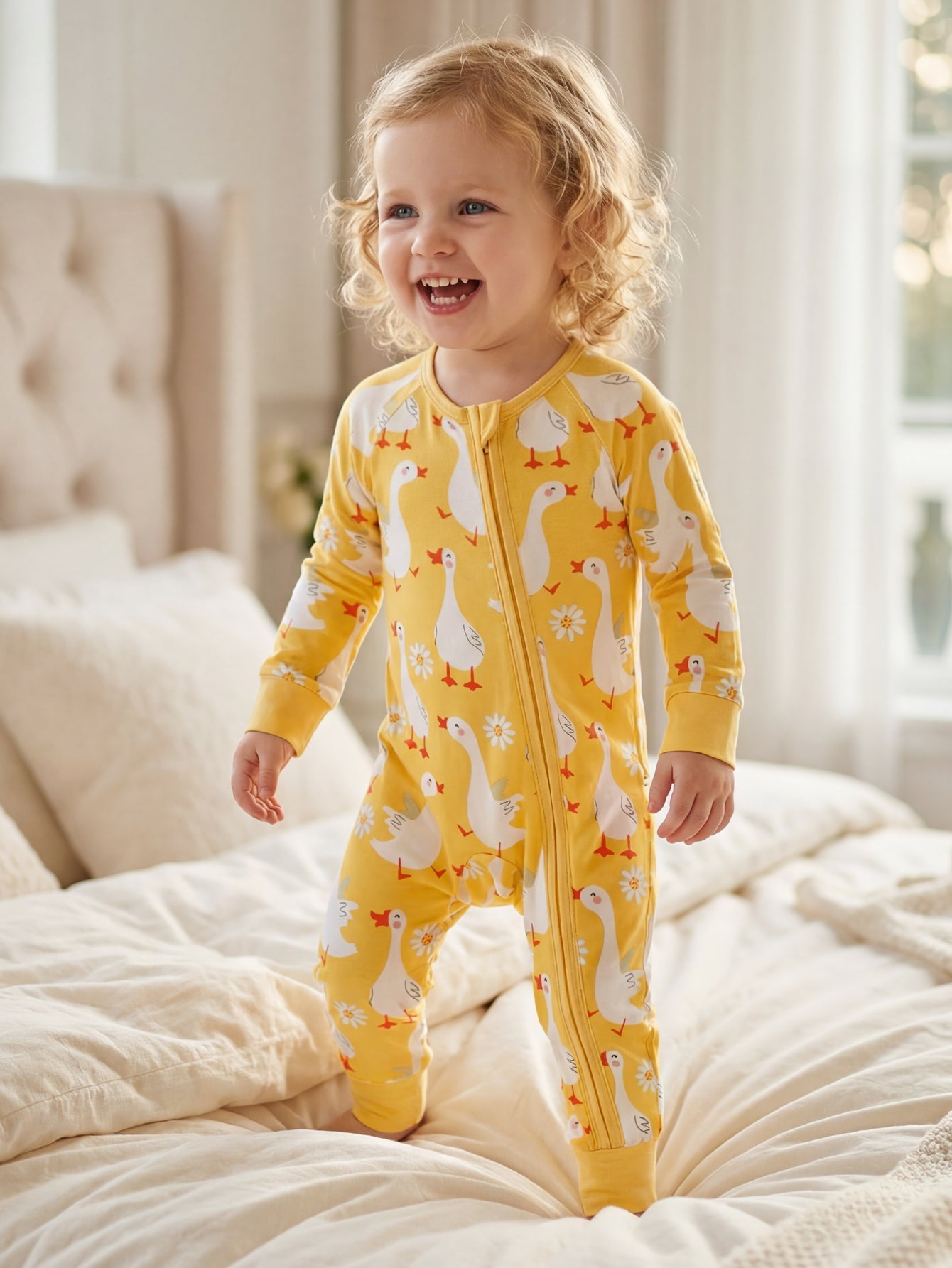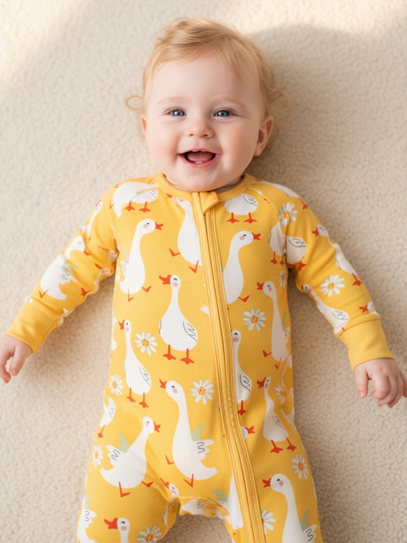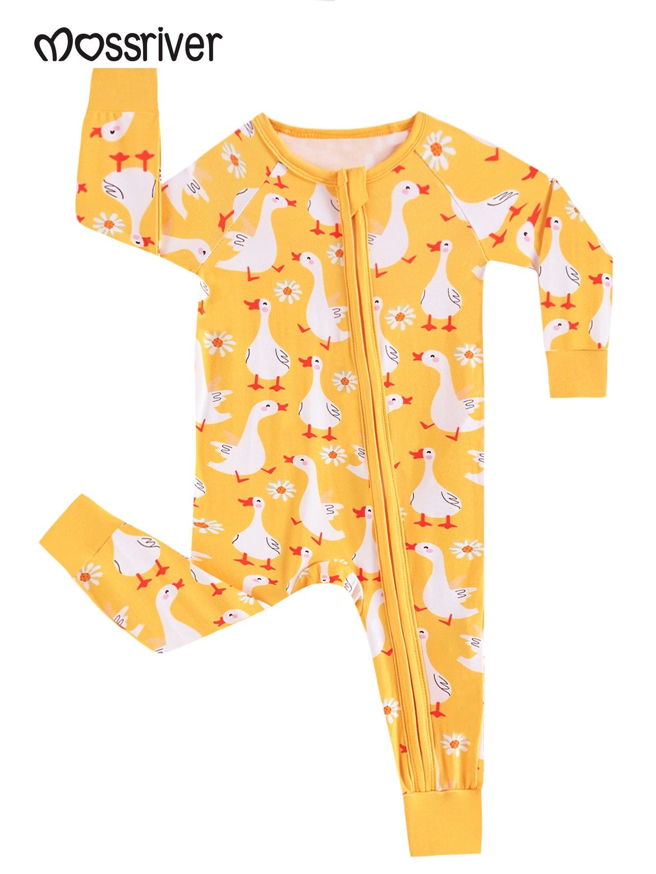 Wrap your little one in the gentle embrace of our MOSSRIVER baby long-sleeve one-piece. Crafted from a premium blend of 95% bamboo fiber and 5% spandex, this sleeper offers exceptional softness against delicate skin, providing ultimate comfort for your baby day and night. The breathable and smooth fabric ensures a cozy feel in any season, making it a versatile addition to your baby's wardrobe. Adorned with a charming all-over print of little swans interspersed with sweet daisies, this yellow one-piece brings a touch of whimsy to bedtime. The convenient zipper closure makes dressing and diaper changes a breeze. This makes a wonderful and practical gift for baby showers and new arrivals, offering both comfort and delightful style.